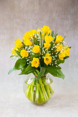 Моя жена была на седьмом небе, когда я подарил ей на день рождения такой оригинальный букет: нарциссы, гипсофила, вакциниум и салал, который придает своей зеленью живой и законченный флористический шедевр. Яркость букету создают, любимые моей жены, желтые нарциссы, которые "улыбаются" и "смеются". Сразу же, увидев букет, моя жена заулыбалась и была в хорошем настроении весь вечер.
