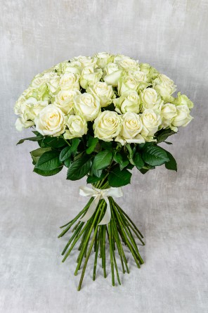 Белые розы – классический букет, производящий неизгладимое впечатление. Прекрасные цветы на длинных ножках (70 см) украшены шелковой лентой и стразом – небольшой акцент, прибавляющий роскоши вашему подарку. 51 белую розу заказать можно прямо сейчас на нашем сайте.