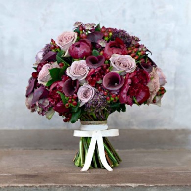 Особенный букет для особенных случаев! Насыщенный красно-лиловый тон букета сделает ваш подарок неповторимым. Розы, пионы, каллы, астранции и гиперикум с зеленью, перевязанные декоративной лентой станут уникальным букетом для ваших близких и знакомых.